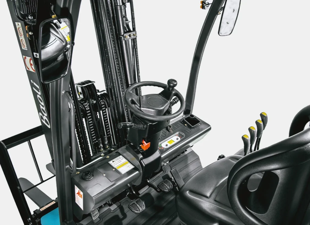Las carretillas KBD+ y KBG+ están equipadas con importantes ayudas a la conducción: el selector electrónico del sentido de la marcha, las palancas hidráulicas de fácil acceso, un tablero de instrumentos con pantalla multifunción y el pedal de freno de estacionamiento. La espaciosa cabina está diseñada para garantizar la máxima visibilidad y un buen confort para el conductor.